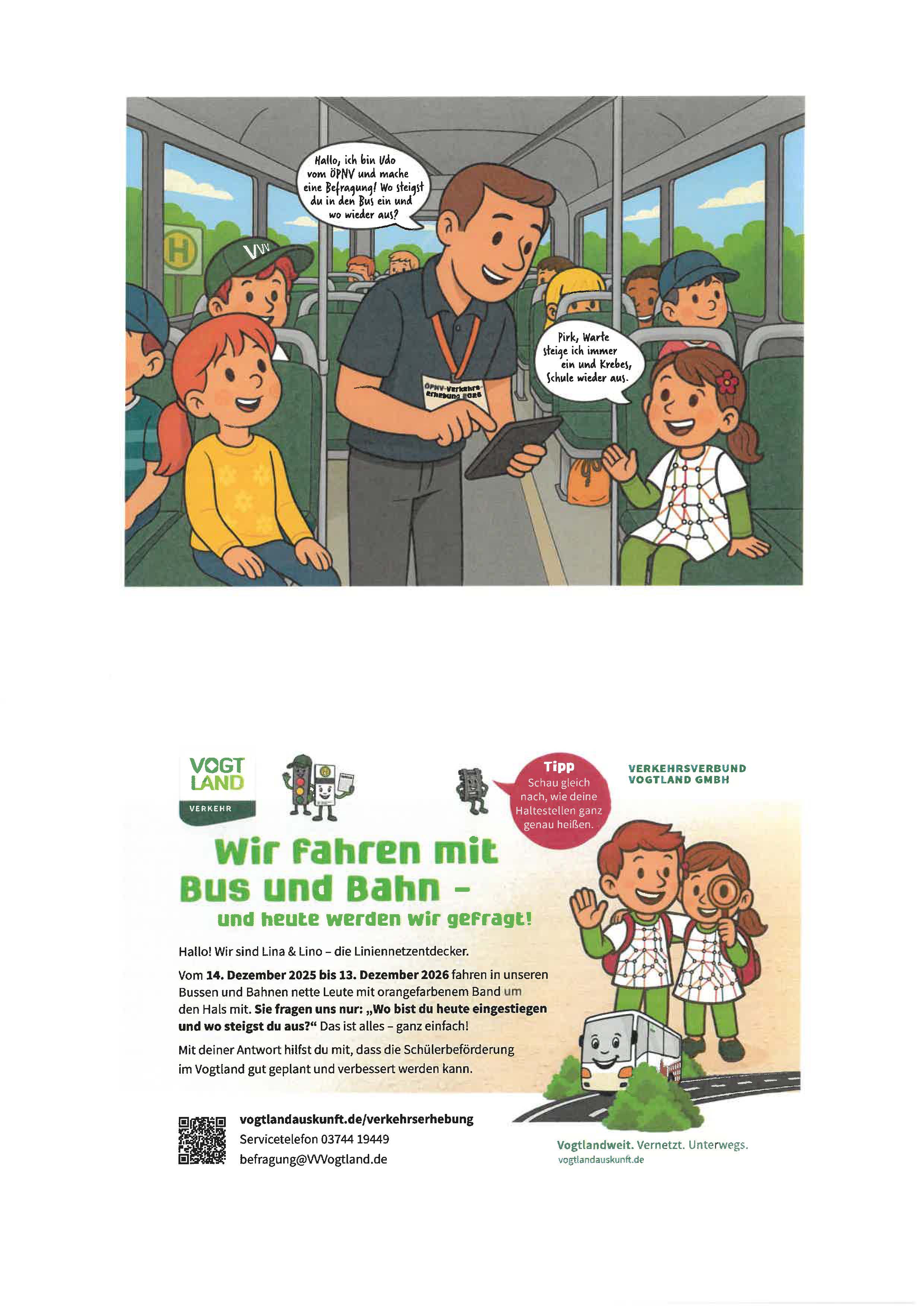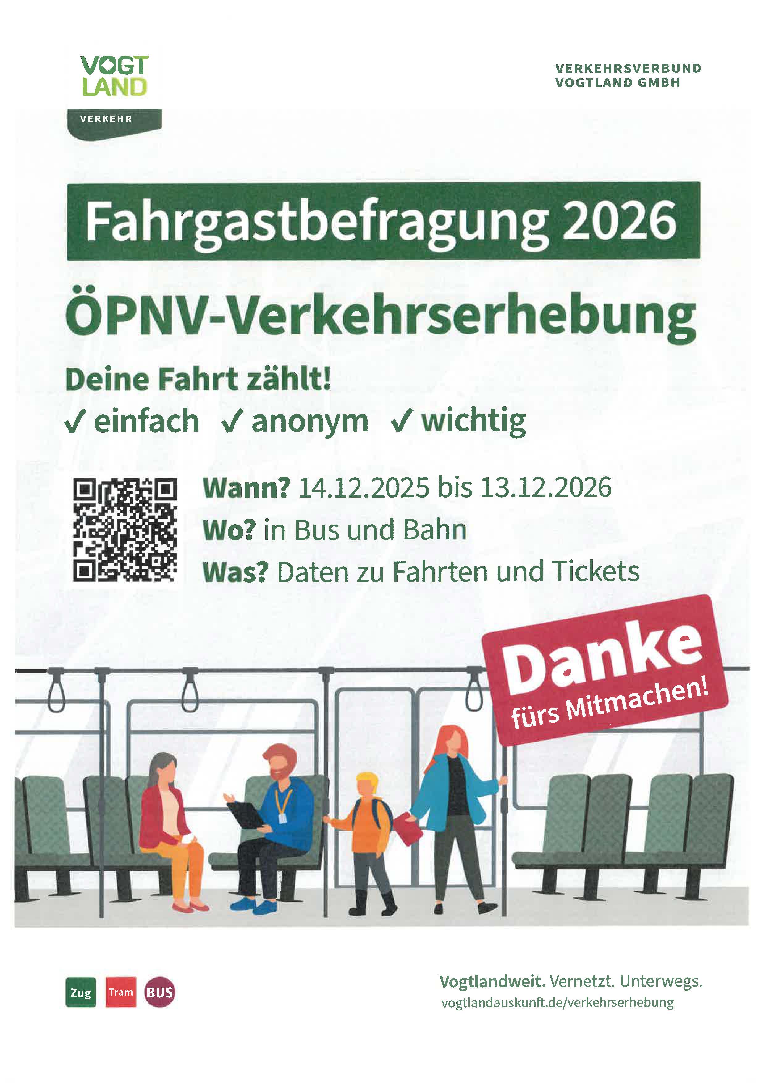 Ab dem 14. Dezember 2025 wird im gesamten Vogtlandkreis eine einjährige Verkehrserhebung in allen Bussen, Straßenbahnen und Zügen durchgeführt. Ziel ist die Erfassung des aktuellen Fahrgastaufkommens, um die Angebote des ÖPNV in der Region zu gestalten. Die Befragung wird im Auftrag vom Zweckverband Öffentlicher Personennahverkehr Vogtland (ZVV) von einem externen, erfahrenen Erhebungsunternehmen (PB Consult GmbH) durchgeführt. Für Erhebungen von Schülerfahrten wird das Personal besonders sensibilisiert und geschult. Die Erhebenden tragen orangefarbene Schlüsselbänder mit der Aufschrift „ÖPNV-Verkehrserhebung 2026“ und sind dadurch deutlich erkennbar. Befragt werden die Schülerinnen und Schüler ausschließlich zu ihrem genutzten Ticket und zum Fahrtverlauf (Einstiegs-/Ausstiegshaltestelle). Wichtig ist daher, dass die Kinder ihre Haltestellen benennen können. Weitere Daten werden nicht erhoben. Die Teilnahme ist anonym und freiwillig.